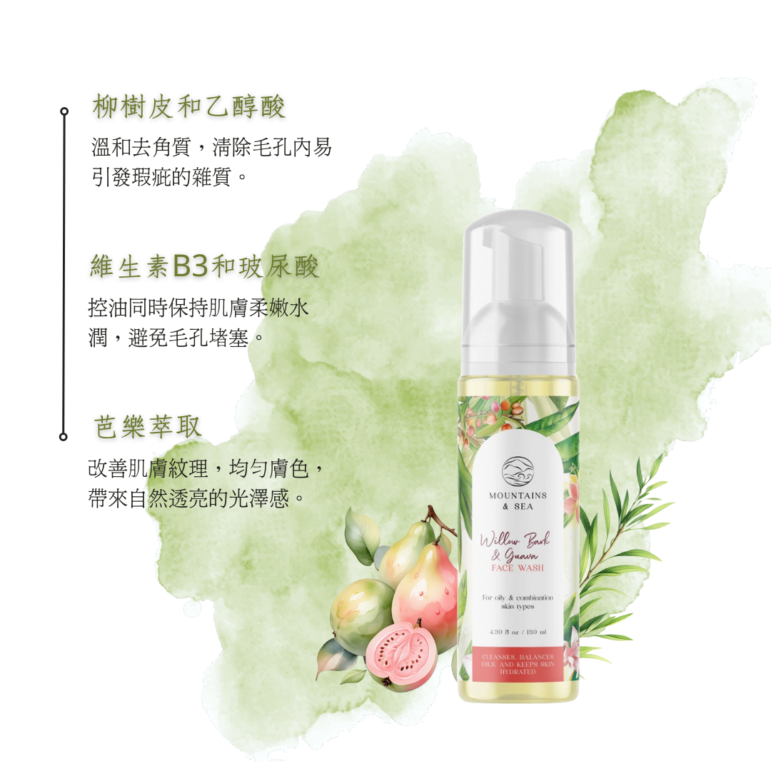 柳樹皮和乙醇酸可溫和淨化您的肌膚,而維生素 B3 則可熟練控油,調理肌膚油水平衡。我們富含維生素 C 的芭樂萃取物可舒緩皮膚,均勻膚色。一絲玻尿酸可滋潤您的肌膚,讓您的臉感覺柔軟、煥然一新。